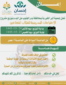إعلان بدء توزيع مشروع( الإحتياجات المدرسية للطلاب المحتاجين) بدعم من منصة إحسان للعمل الخيري جمعية البر ببدر الجنوب شارك بتعليقك إلغاء الردلن يتم نشر عنوان بريدك الإلكتروني. الحقول الإلزامية مشار إليها بـ *التعليق * الاسم * البريد الإلكتروني * الموقع الإلكتروني احفظ اسمي، بريدي الإلكتروني، والموقع الإلكتروني في هذا المتصفح لاستخدامها المرة المقبلة في تعليقي.