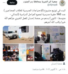 البدء في توزيع مشروع( الإحتياجات المدرسية للطلاب المحتاجين) بدعم من منصة إحسان للعمل الخيري جمعية البر ببدر الجنوب شارك بتعليقك إلغاء الردلن يتم نشر عنوان بريدك الإلكتروني. الحقول الإلزامية مشار إليها بـ *التعليق * الاسم * البريد الإلكتروني * الموقع الإلكتروني احفظ اسمي، بريدي الإلكتروني، والموقع الإلكتروني في هذا المتصفح لاستخدامها المرة المقبلة في تعليقي.