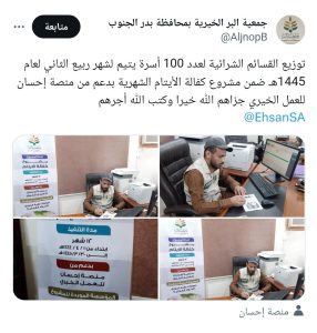 توزيع القسائم الشرائية لعدد 100 أسرة يتيم الدفعة الحادي عشر ضمن مشروع كفالة الأيتام المدعوم من منصة إحسان للعمل الخيري جمعية البر ببدر الجنوب شارك بتعليقك إلغاء الردلن يتم نشر عنوان بريدك الإلكتروني. الحقول الإلزامية مشار إليها بـ *التعليق * الاسم * البريد الإلكتروني * الموقع الإلكتروني احفظ اسمي، بريدي الإلكتروني، والموقع الإلكتروني في هذا المتصفح لاستخدامها المرة المقبلة في تعليقي.